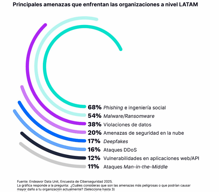 De acuerdo con el reporte Ciberseguridad, habilitador de confianza y competitividad, elaborado por Incode y Endeavor, las organizaciones en LATAM enfrentan 2,803 ataques cibernéticos por semana, un 40 % más del promedio global, mientras que el impacto financiero de una brecha de datos supera los 3.8 millones de dólares.