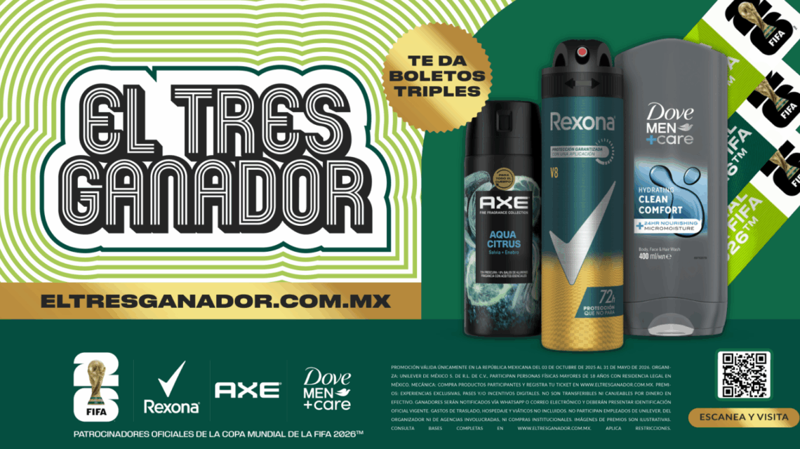 El fútbol no se vive, se siente. Y cuando México vuelve a ser anfitrión de la Copa Mundial de la FIFA™ por tercera ocasión, la pasión se triplica. Con ese espíritu, Rexona, Axe y Dove —tres marcas icónicas de Unilever— presentan «El Tres Ganador», una promoción inédita que regalará 184 pases triples para asistir a los partidos (en México) del torneo más esperado del planeta, además de más de 3,000 premios adicionales.